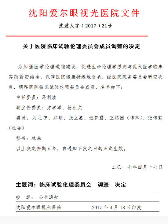 关于医院临床试验伦理委员会成员调整的决定
